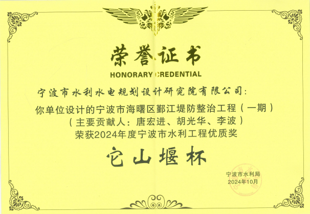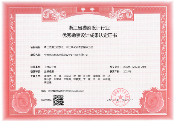 在工程項目方面,獲得2022年度全國優(yōu)秀工程咨詢成果獎、2024年度寧波市優(yōu)秀勘察設(shè)計獎、2024年浙江省勘察設(shè)計行業(yè)優(yōu)秀勘察設(shè)計”綜合類成果獎、寧波市優(yōu)秀水利工程設(shè)計二等獎、“浙江省文明標(biāo)化工地”稱號、“2024年度寧波軌道交通市域鐵路工程立功競賽先進集體”等各類獎項十余項。
