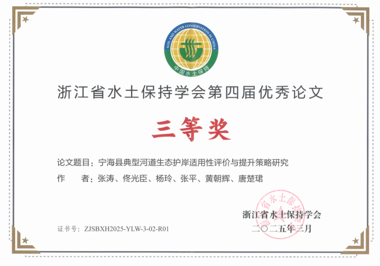 會議現場通報了2024年度生產建設項目水土保持方案優(yōu)秀單位、2024年度生產建設項目水土保持監(jiān)測優(yōu)秀單位,并為獲獎集體進行表彰。隨后,又現場表彰了浙江省水土保持學會第四屆優(yōu)秀論文評選結果。我院榮獲2024年度生產建設項目水土保持方案優(yōu)秀單位、2024年度生產建設項目水土保持監(jiān)測優(yōu)秀單位兩項集體榮譽,并且以論文《寧海縣典型河道生態(tài)護岸適用性評價與提升策略研究》獲得浙江省水土保持學會第四屆優(yōu)秀論文三等獎。