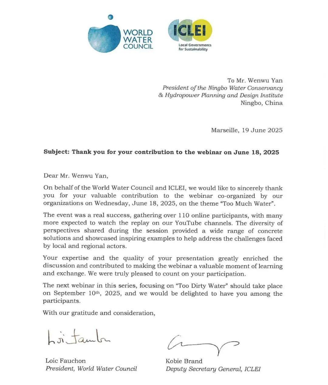 研討會圓滿落幕后,世界水理事會特向嚴文武院長發(fā)來感謝信,并盛情邀請其參加下一屆研討會。