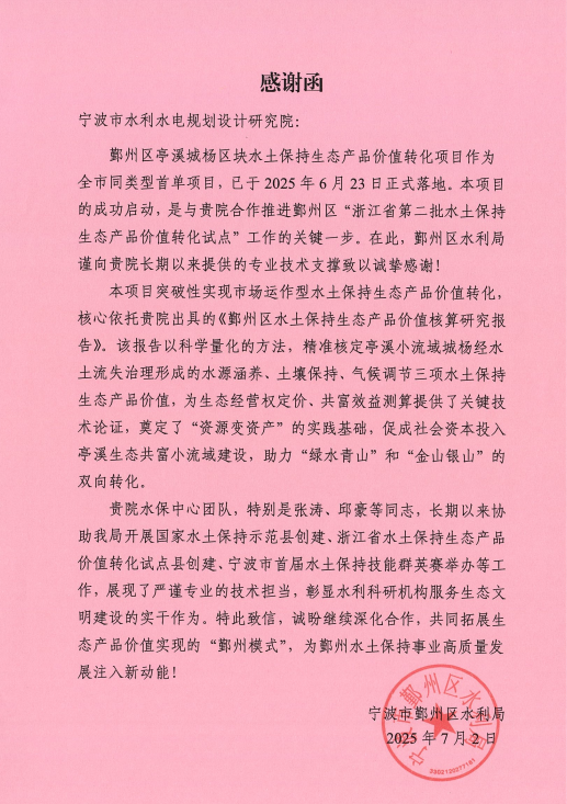 鄞州區(qū)水利局在感謝信中特別指出,我院提供的技術(shù)支持不僅專業(yè)高效,更體現(xiàn)了強(qiáng)烈的責(zé)任意識和服務(wù)意識。信中高度贊揚(yáng)了水保中心團(tuán)隊(duì),特別是張濤、邱豪等同志,在相關(guān)工作中展現(xiàn)的嚴(yán)謹(jǐn)務(wù)實(shí)的工作作風(fēng)、精益求精的專業(yè)態(tài)度,以及不辭辛勞的奉獻(xiàn)精神。這份肯定不僅是對項(xiàng)目組的褒獎(jiǎng),更是對我院全體職工莫大的鼓舞和激勵(lì)。