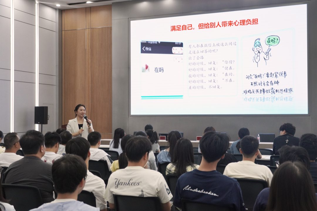 陳瑛老師的講座圍繞自我激勵、協(xié)同溝通、對外溝通、對上溝通四大維度展開。首先,陳瑛老師分別以工作場景和生活場景中的溝通對話與大家進行互動,帶領(lǐng)大家對“高情商”進行思考與剖析,由此展開當天的主題。隨后,結(jié)合豐富的實戰(zhàn)案例與互動環(huán)節(jié),陳瑛老師層層遞進,深入淺出地講解了如何在日常工作中實現(xiàn)高效溝通,激發(fā)自我驅(qū)動力,提升團隊協(xié)同效能。在長達2.5小時的課程中,陳瑛老師還結(jié)合商務(wù)禮儀的要點,根據(jù)不同場景對溝通實操進行了解析。并強調(diào),良好的溝通不僅是技巧,更是一種心態(tài)與習慣的培養(yǎng),也是實現(xiàn)個人與團隊實現(xiàn)共同成長的重要途徑。
