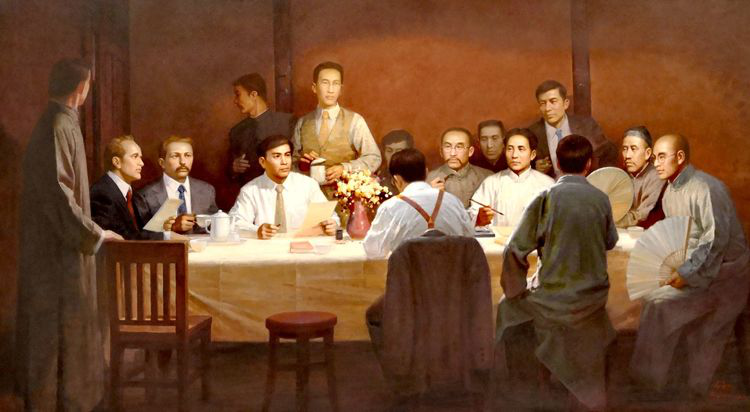 7月23日晚,中國共產(chǎn)黨第一次全國代表大會在上海法租界望志路106號(今興業(yè)路76號)正式開幕。會址設在李書城、李漢俊兄弟住宅,大家圍坐在客廳長餐桌四周,室內(nèi)沒有特別布置,陳設簡單,氣氛莊重。出席者有上海的李漢俊、李達;北京的張國燾、劉仁靜;長沙的毛澤東、何叔衡;武漢的董必武、陳潭秋;濟南的王盡美、鄧恩銘;廣州的陳公博;留日學生周佛海以及陳獨秀委派的包惠僧。陳獨秀和李大釗因公務在身未出席會議,而在代表們心目中他們?nèi)允屈h的主要創(chuàng)始人和領袖。