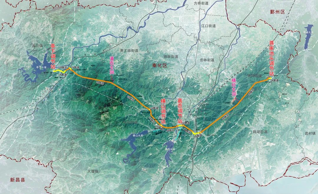 作為浙江省重點水利工程建設(shè)項目,寧波市水庫群東西線聯(lián)通工程位于寧波市奉化區(qū)南部山區(qū),工程設(shè)計輸水規(guī)模為40萬m3/d,項目投資約20億元。建設(shè)內(nèi)容包括一條干線、兩條支線,沿線調(diào)節(jié)站及各類閥井。全線總長約40.54km,其中干線長約36.76km,隧洞長度約31.09km,管道長度約5.67km,橫山支線長約1.45km,葛岙支線長約2.33km;新建4座調(diào)節(jié)站,分別為新建亭下調(diào)節(jié)站、橫山支線調(diào)節(jié)站、蔣家池頭調(diào)節(jié)站、葛岙支線調(diào)節(jié)站;新建各類檢修閥井若干。工程等別為Ⅲ等,工程規(guī)模為中型。主要建筑物如輸水隧洞、輸水管道及調(diào)節(jié)站等建筑物級別為 3 級。洪水重現(xiàn)期為 30 年一遇洪水設(shè)計,100 年一遇洪水校核。