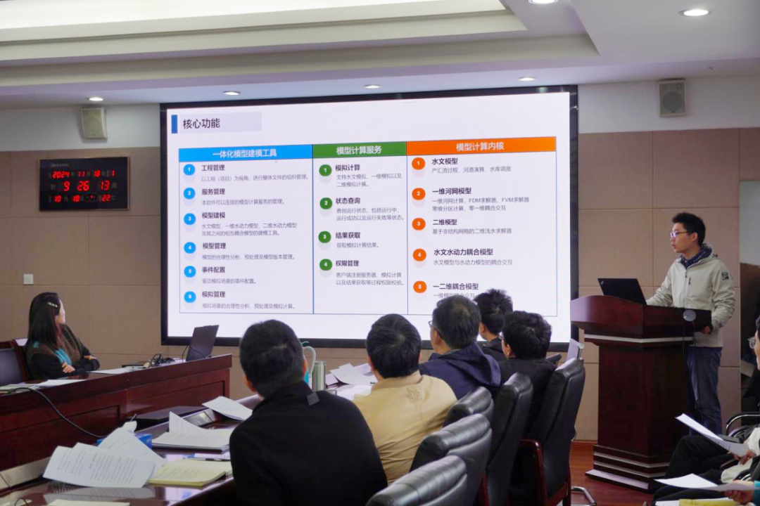 隨后,平臺(tái)研發(fā)團(tuán)隊(duì)代表陳龍贊對(duì)“澤圖水文水動(dòng)力一體化模型平臺(tái)”進(jìn)行詳細(xì)介紹,并進(jìn)行現(xiàn)場實(shí)操演示。該平臺(tái)是一套我院自主研發(fā)的以組件化建模、并行化求解、在線化計(jì)算、一體化耦合、國產(chǎn)化支持為核心的水文水動(dòng)力模型平臺(tái),能夠滿足包括產(chǎn)匯流計(jì)算、水庫調(diào)度、一維河網(wǎng)、二維淹沒、水文水動(dòng)力耦合、一二維水動(dòng)力耦合在內(nèi)的多種模擬需求,適用于獨(dú)立部署、嵌入第三方項(xiàng)目等多種應(yīng)用場景?;诮9ぞ摺⒛P头?wù)、計(jì)算核心三分離的設(shè)計(jì)架構(gòu),平臺(tái)具備分布式部署、集群化管理、多節(jié)點(diǎn)負(fù)載均衡的動(dòng)態(tài)能力,滿足靈活適用多種尺度的計(jì)算需要。