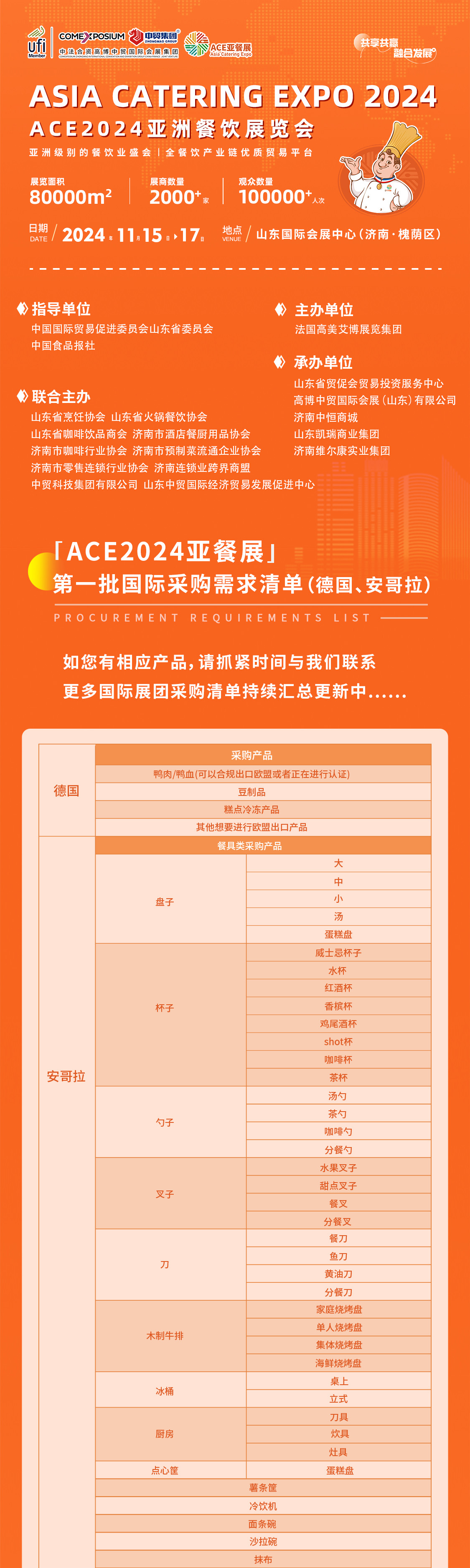 值得注意的是,今年的ACE亞餐展與往年不同的是,將切實(shí)迎來(lái)國(guó)際買(mǎi)家團(tuán)專(zhuān)業(yè)觀(guān)眾。目前,已有德國(guó)、安哥拉等多個(gè)國(guó)際展團(tuán)明確將在展會(huì)現(xiàn)場(chǎng)進(jìn)行貿(mào)易對(duì)接并進(jìn)行國(guó)際合作項(xiàng)目發(fā)布。德國(guó)、安哥拉也于此前陸續(xù)發(fā)來(lái)大額采購(gòu)清單,便于ACE2024亞餐展組委會(huì)為他們匹配相關(guān)的國(guó)內(nèi)企業(yè)。此外,更多國(guó)家采購(gòu)團(tuán)也正在積極對(duì)接中。