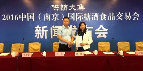 發(fā)布會正式開始之前,海南供銷大集控股有限公司華東區(qū)副總裁韓穎女士與山東中貿(mào)國際經(jīng)濟(jì)貿(mào)易推廣服務(wù)中心董事長杜磊先生就“供銷大集”2016中國(南京)國際糖酒會簽署冠名合作協(xié)議。